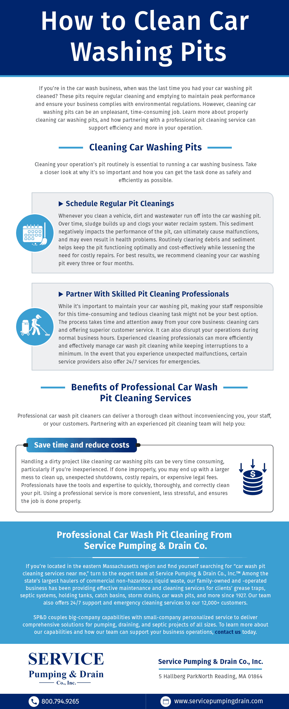- Save time and reduce costs. Handling a dirty project like cleaning car washing pits can be very time consuming, particularly if you’re inexperienced. If done improperly, you may end up with a larger mess to clean up, unexpected shutdowns, costly repairs, or expensive legal fees. Professionals have the tools and expertise to quickly, thoroughly, and correctly clean your pit. Using a professional service is more convenient, less stressful, and ensures the job is done properly.