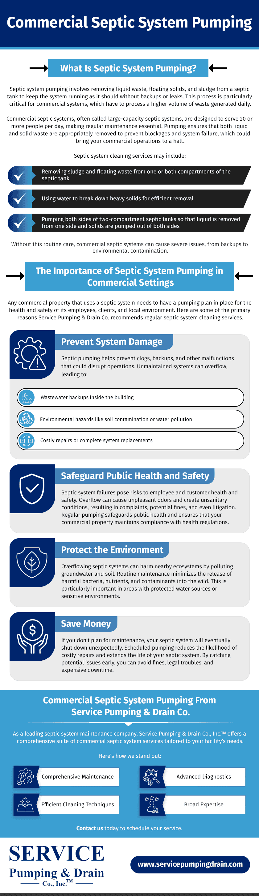 As a leading septic system maintenance company, Service Pumping & Drain Co., Inc.™ offers a comprehensive suite of commercial septic system services tailored to your facility’s needs. Here’s how we stand out: